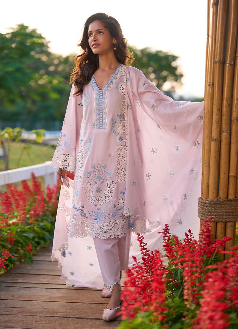 Light and graceful in a soft pink hue, this unstitched ensemble is crafted from pure cotton lawn, featuring delicate embroidered motifs scattered across the fabric for a refined, airy look. Intricately detailed borders and contrast accents in soft tones add depth and character to the design. Paired with a pure cotton cambric trouser and a voile dupatta that enhances its fluid feel, this set is ideal for fresh summer dressing with an elegant finish.