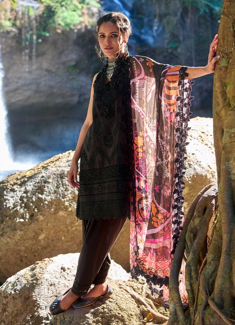 Rich and striking in a deep black hue, this unstitched pure cotton lawn shirt is adorned with intricate tonal embroidery that creates a refined, textured surface. Delicate motifs and ornate borders add depth while maintaining a graceful balance. Paired with a pure cotton cambric trouser and a sheer chiffon dupatta featuring subtle contrast, the ensemble feels light, breathable, and effortlessly elegant, making it ideal for polished summer wear with a bold, timeless appeal.