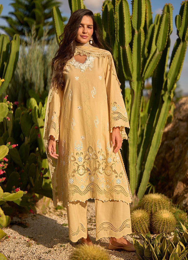 Radiant and uplifting in a soft yellow hue, this unstitched ensemble is crafted from pure cotton lawn, featuring delicate embroidered motifs and intricate cutwork patterns that bring texture and depth to the fabric. Gracefully designed borders and fine detailing enhance its airy, sunlit feel. Paired with a pure cotton cambric trouser and a lightweight chiffon dupatta that adds fluidity, this set is perfect for bright summer days and effortless seasonal dressing.
