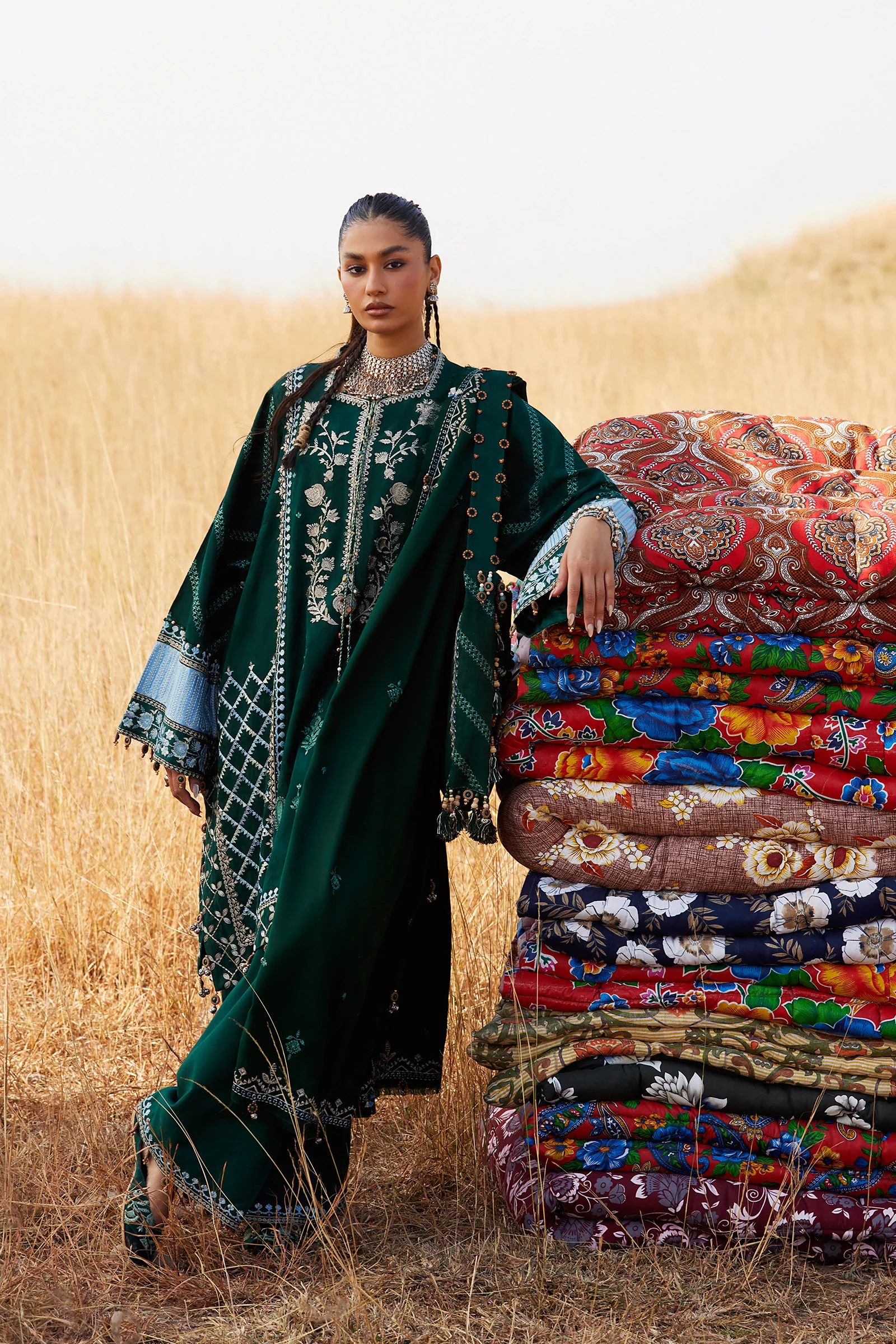 Yasmin — winter green jacquard khaddar shirt and trouser, layered with a soft woolen shawl, infused with steel-blue tribal echoes. Each thread whispers the stories of ancestral motifs, stitched with care, weaving a quiet winter tale that moves with effortless elegance. Moody, grounded, and timeless — Yasmin is winter embodied.